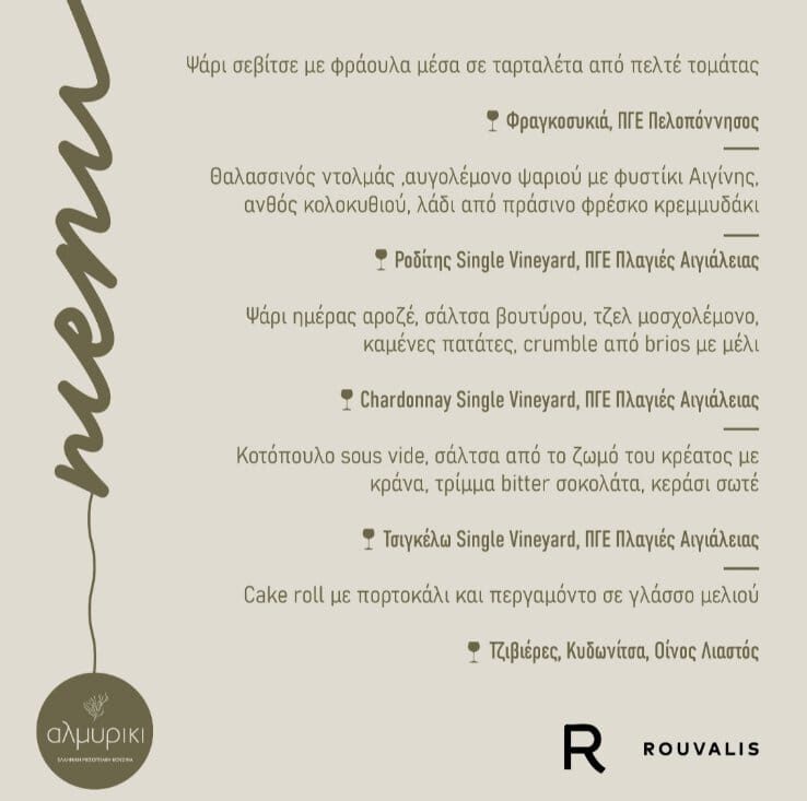 Το Σάββατο 22 Νοεμβρίου το Εστιατόριο Αλμυρίκι, υποδέχεται το οινοποιείο Ρούβαλης σε ένα γευστικό πάντρεμα γεύσεων της Πελοποννήσου με αρκετές εκπλήξεις.