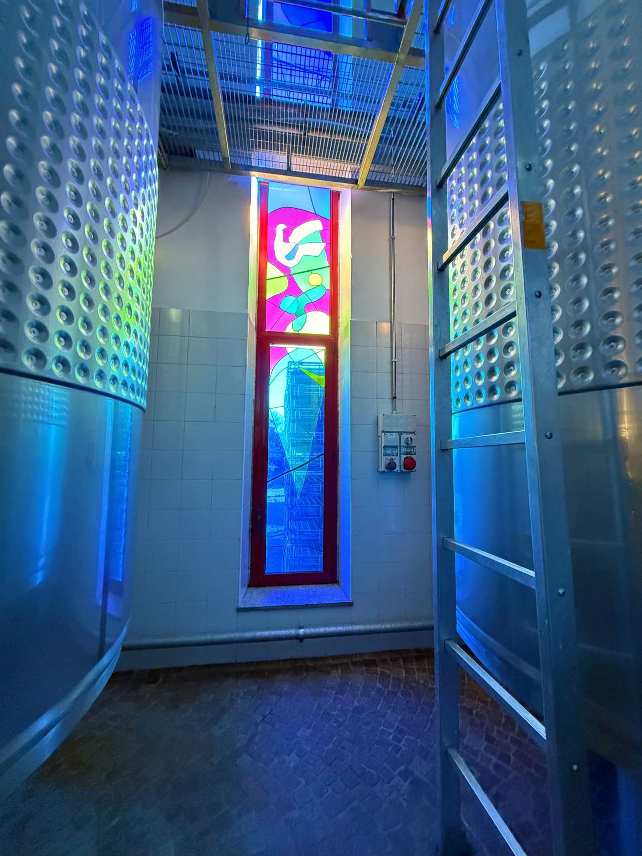Μπαίνει από πολύχρωμα βιτρό –φιλοτεχνημένα αποκλειστικά για την οικογένεια– και χρωματίζει τον χώρο με αποχρώσεις που αλλάζουν καθώς περνά η ώρα. Ένα από αυτά τα βιτρό, όπως μας εξήγησε η Francesca, γεννήθηκε από μια δύσκολη χρονιά: παγετός την άνοιξη, χαμένη σοδειά, ατελείωτη εργασία για να σωθεί ό,τι μπορούσε να σωθεί. «Ήταν τότε», είπε, «που καταλάβαμε ότι ο αμπελώνας μπορεί να σε δοκιμάσει όσο και να σε ανταμείψει». Το βιτρό αυτό έγινε σύμβολο επιμονής, ένας φόρος τιμής στη σιωπηλή δύναμη του Aldo και της Milena, των γονιών της.